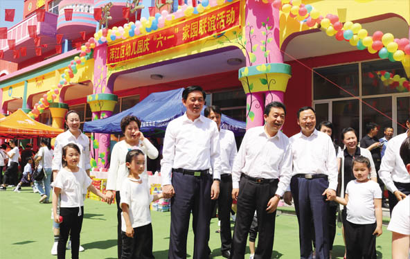浑江区幼儿园是我市一家注重幼儿智力开发、着力培育幼儿健全人格的现代化省级示范园。多年来,该园秉承着“一切为了孩子”的办园宗旨,遵循幼儿身心发展规律,以幼儿情感教育为主线,开设了篮球、足球、奥尔夫音乐、早期阅读等课程,幼儿教学取得了可喜成绩。在这个专属于孩子们的欢庆节日里,浑江区幼儿园彩旗飘扬、装点一新,小朋友们身着艳丽的服装,正举行联欢活动。张志军来到他们中间,观看篮球、腰鼓等节目,与幼儿、家长一起玩起亲子互动游戏,陪孩子度过一个欢乐的节日。